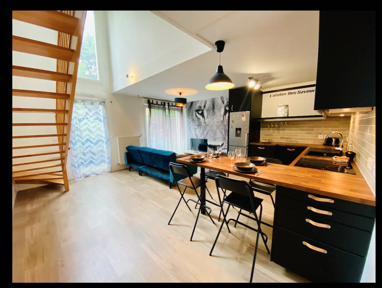 - Une cuisine ouverte et équipée